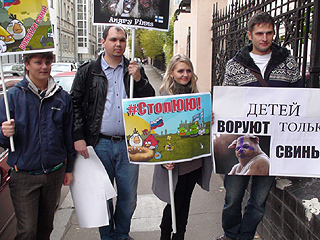 Пикеты проходят под лозунгами: "Нет произволу финской ювенальной юстиции!", "Финны, не крадите детей", "Они забрали наших детей!", "Детей воруют только свиньи", "Рожайте сами!", "Angry finns".