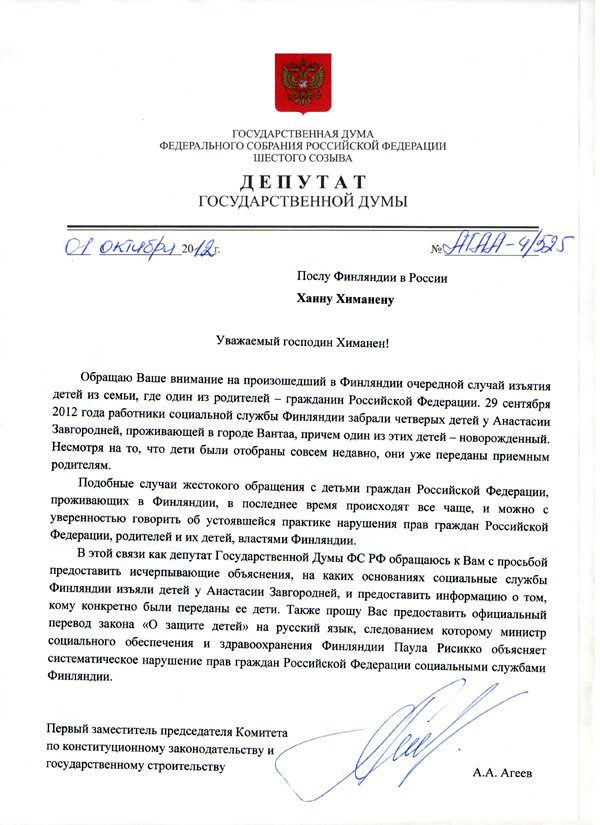 "Обращаю Ваше внимание на произошедший в Финляндии очередной случай изъятия детей из семьи, где один из родителей – гражданин Российской Федерации. 29 сентября 2012 года работники социальной службы Финляндии забрали четверых детей у Анастасии Завгородней, проживающей в городе Вантаа, причем один из этих детей – новорожденный. Несмотря на то, что дети были отобраны совсем недавно, они уже переданы приемным родителям", – написал Александр Агеев.