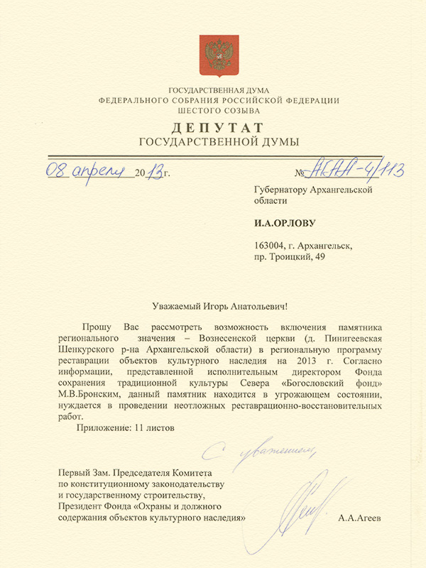 Александр Агеев направил два депутатских запроса с просьбой включить в программы финансирования реставрации две церкви в Архангельской области 8 апреля 2013 Депутат Госдумы, первый заместитель председателя комитета Государственной Думы ФС РФ по конституционному законодательству и государственному строительству Александр Агеев направил запросы министру культуры РФ В.Р.Мединскому и Губернатору Архангельской области И.А.Орлову:
