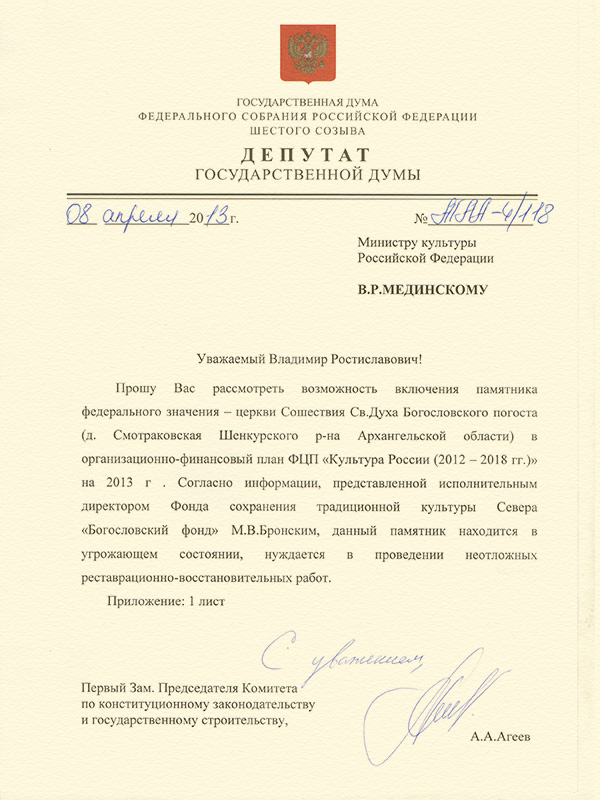 Второй запрос адресован министру культуры РФ Владимиру Мединскому. В нем – просьба рассмотреть возможность включения в организационно-финансовый план ФЦП "Культура России 2012 2018гг" на 2013 год церкви Сошествия Святого Духа Богословского погоста в деревне Смотраковская Шенкурского района.