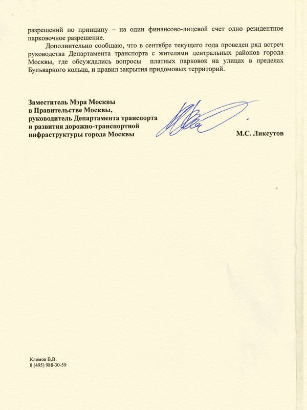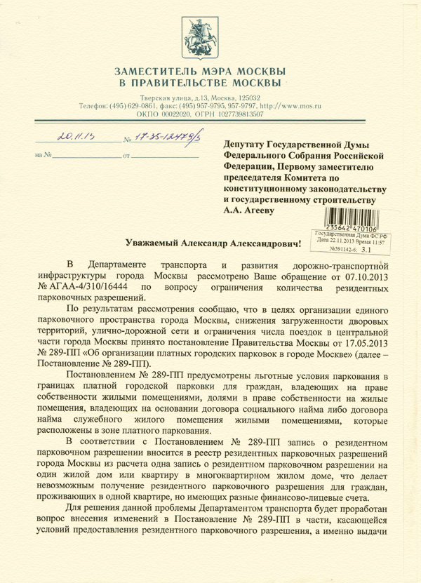 Сегодня я получил ответ на свой запрос, который, оказывается, был перенаправлен в Департамент транспорта. Максим Ликсутов довольно пространно сообщил мне о том, как много делается его ведомством в этом направлении, о ряде проведенных встреч с жителями центральных районов столицы. Однако инициатива по созданию межведомственной согласительной комиссии проигнорирована, а на наше предложение выделить по два льготных разрешения на одну квартиру Максим Станиславович, сославшись на Постановление 289-ПП, ответил завуалированным отказом.